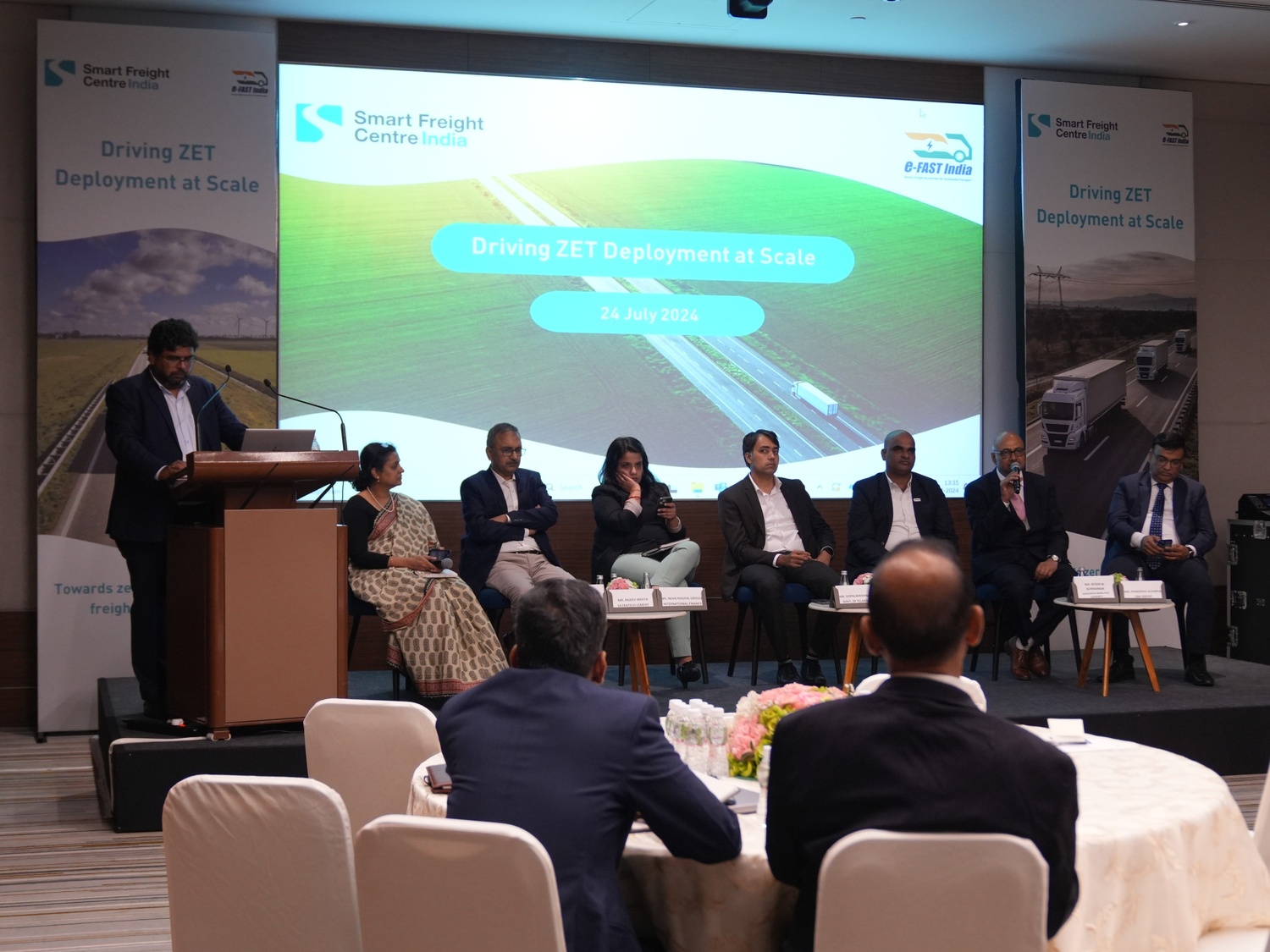On 24th July, Smart Freight Centre (SFC) organized a workshop on strategies to drive zero-emission truck (ZET) deployment at scale. The workshop was held under the e-FAST (Electric Freight Accelerator for Sustainable Transport – India) banner and moderated by Sharvari Patki, Program Head for e-Mobility at WRI India. The discussion convened decision-makers in the Indian freight ecosystem to deliberate on opportunities for ZET market development and deployment, aiming to translate ambition into tangible project.